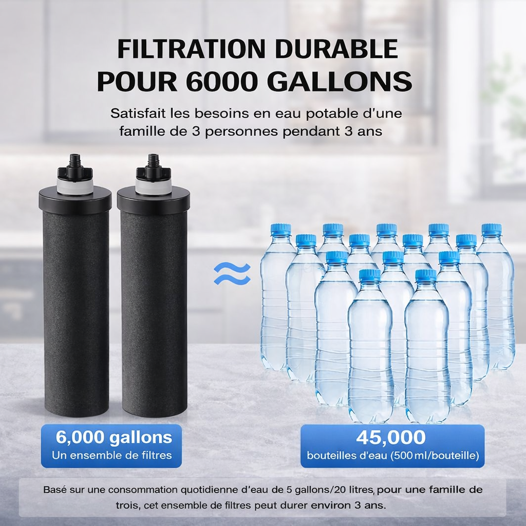 La durée de vie d'un filtre dépend du modèle et de la fréquence d'utilisation. En général, nos filtres à eau doivent être remplacés tous les 6 à 12 mois, selon l'utilisation et la qualité de l'eau. Vous trouverez des informations spécifiques dans les recommandations d'entretien de chaque produit.